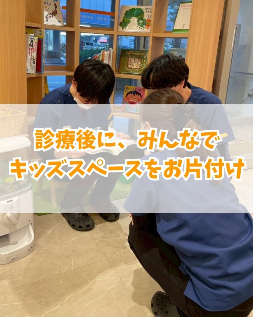 • 診療後に、みんなでキッズスペースをお片付けする歯科医師陣。