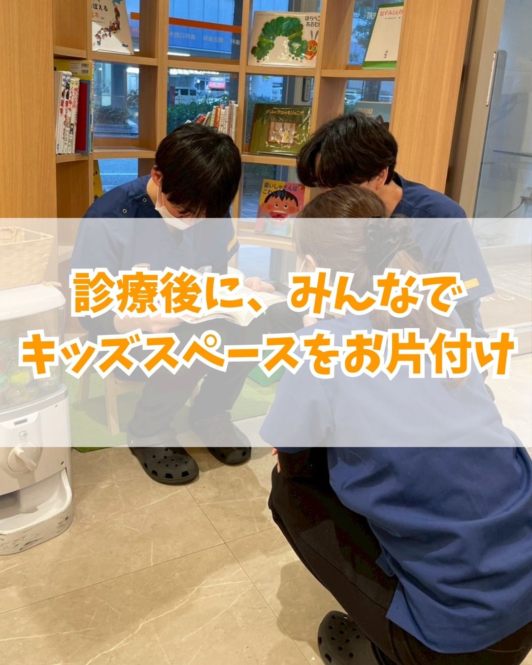 診療後に、みんなでキッズスペースをお片付けする歯科医師陣。